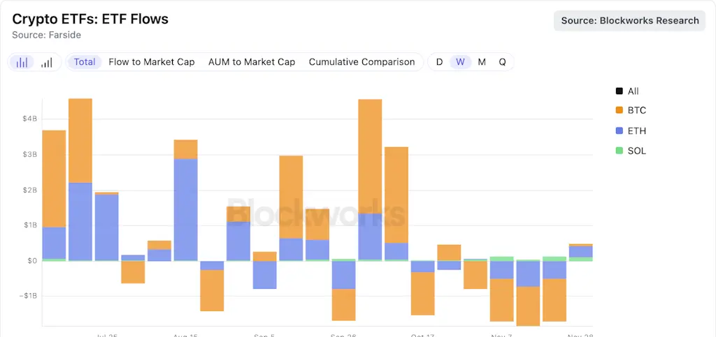 A reversão positiva já começou, com a primeira semana de Dezembro a marcar a primeira semana de fluxos líquidos positivos para ETFs de BTC desde o final de Outubro, com $70.2 milhões em entradas líquidas. Os ETFs de Ethereum e Solana mostraram um impulso mais forte com $312 milhões e $108 milhões em entradas líquidas, respetivamente.