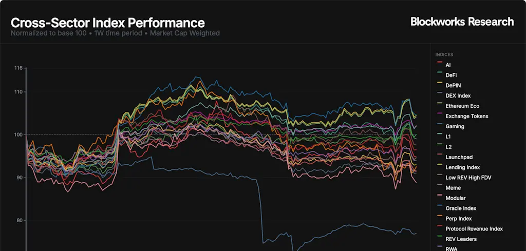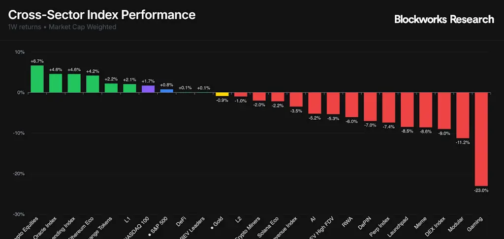 Na última semana, oráculos, empréstimos e tokens do ecossistema Ethereum apresentaram bom desempenho, cada um a subir pouco mais de 4%. As ações de cripto lideraram com ganhos de 6.7%, impulsionadas principalmente pelo desempenho superior da HOOD.