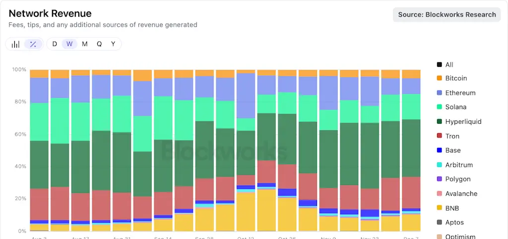 Os números de receita de rede mantêm-se estáveis de semana para semana, com a Hyperliquid a liderar com 35% de todas as receitas de rede, seguida pela Tron (20%) e Solana (15%). A receita da BNB chain mantém-se em mínimos após os picos de Outubro, com a Hyperliquid e Solana a capturarem a maioria da receita transferida.