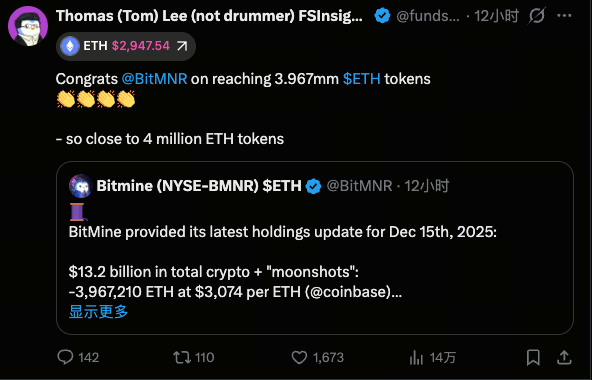 Até ao final de 2025, o mercado de criptomoedas voltou a captar a atenção dos investidores internacionais. O capital institucional mantém-se a entrar nas alocações de ativos de referência, com a BitMine Immersion Technologies (BMNR), liderada por Tom Lee, a avançar de forma agressiva para adquirir Ethereum. Relatórios recentes indicam que a empresa realizou uma compra de cerca de 320 milhões $ em Ether (ETH), elevando as suas reservas totais para mais de 3,96 milhões ETH—mais de 3,2% do fornecimento em circulação.
