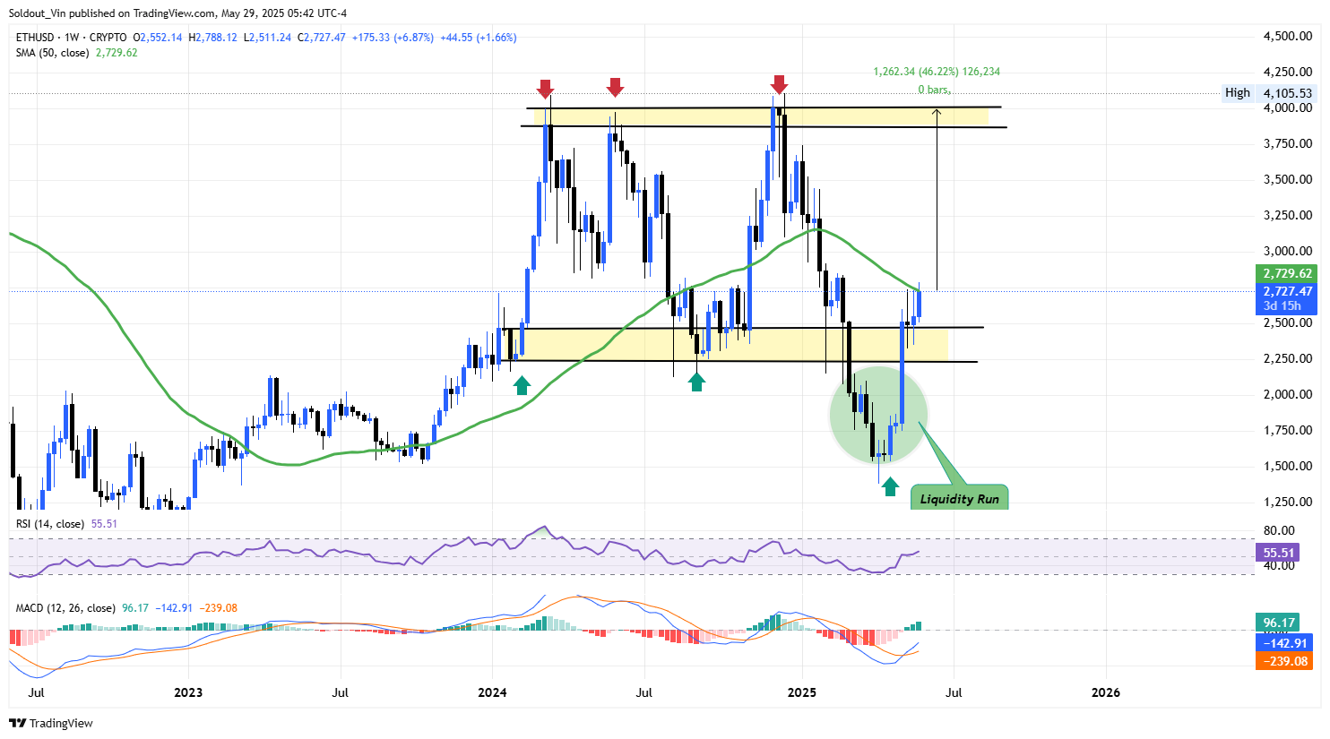 ETH está sendo negociado a $2,729 neste gráfico, com uma vela semanal mostrando uma ação bastante agitada. O preço recebeu um grande impulso de uma corrida de liquidez abaixo de uma zona de consolidação de 392 dias, e agora está de volta na faixa entre $2,250 e $4,105.