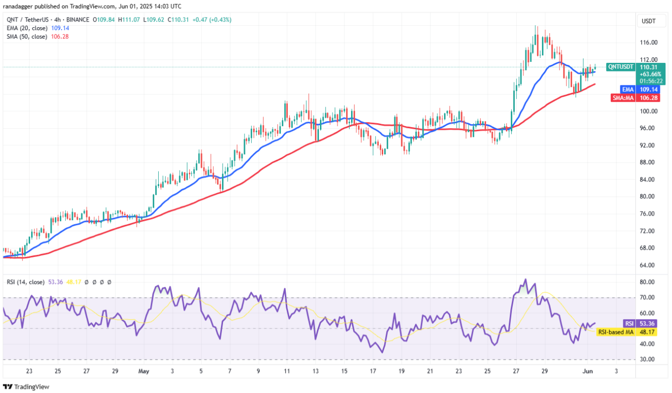 Quant (QNT) virou para baixo a partir do nível de $120 no dia 28/5, no entanto, a atual correção está encontrando suporte na linha EMA de 20 dias a $101.