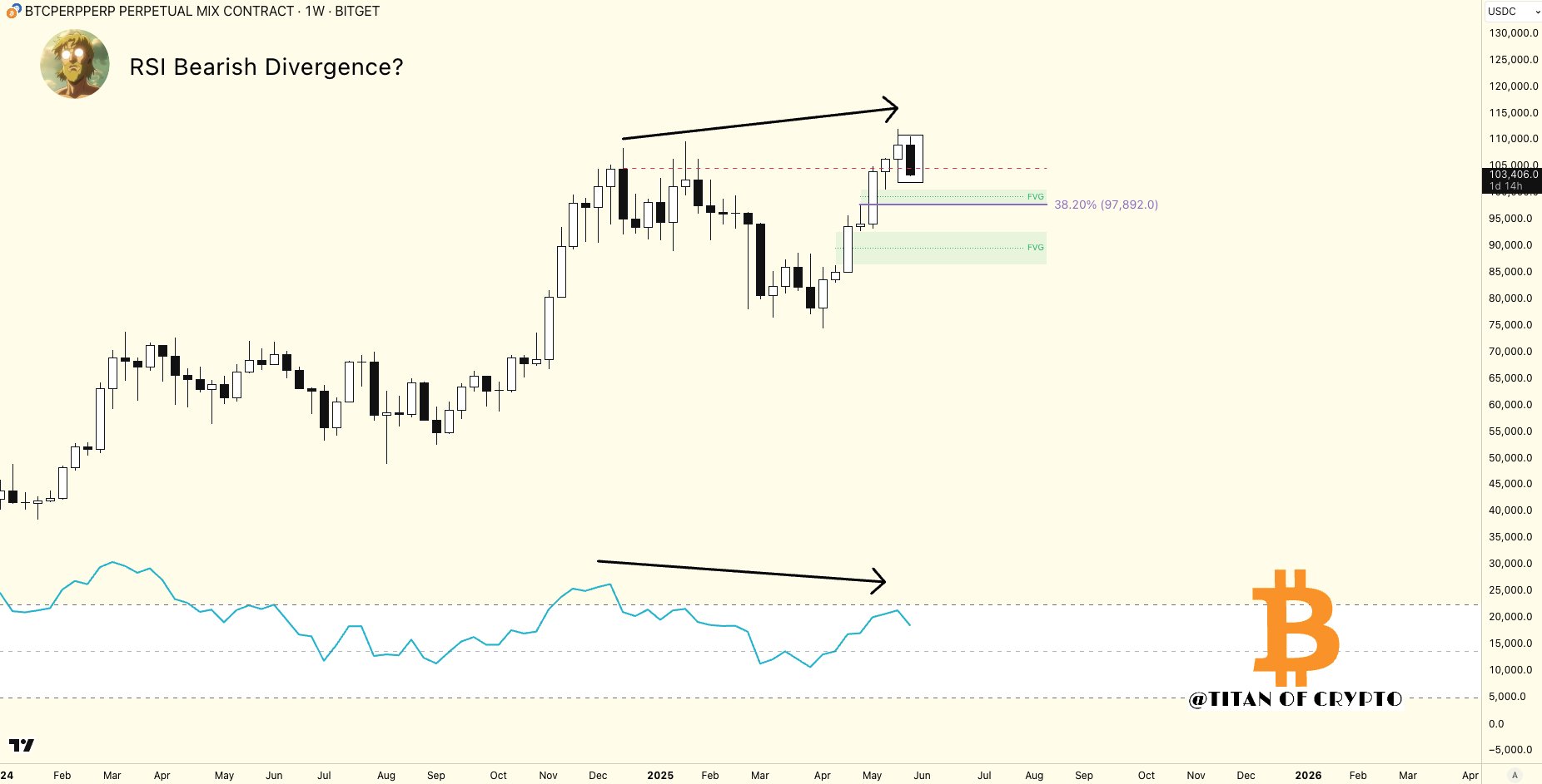 “A divergência de RSI em queda potencial está se formando no gráfico semanal. Ainda não está confirmada, mas é um sinal a ser monitorado”, disse ele aos seguidores X no dia 31 de maio.