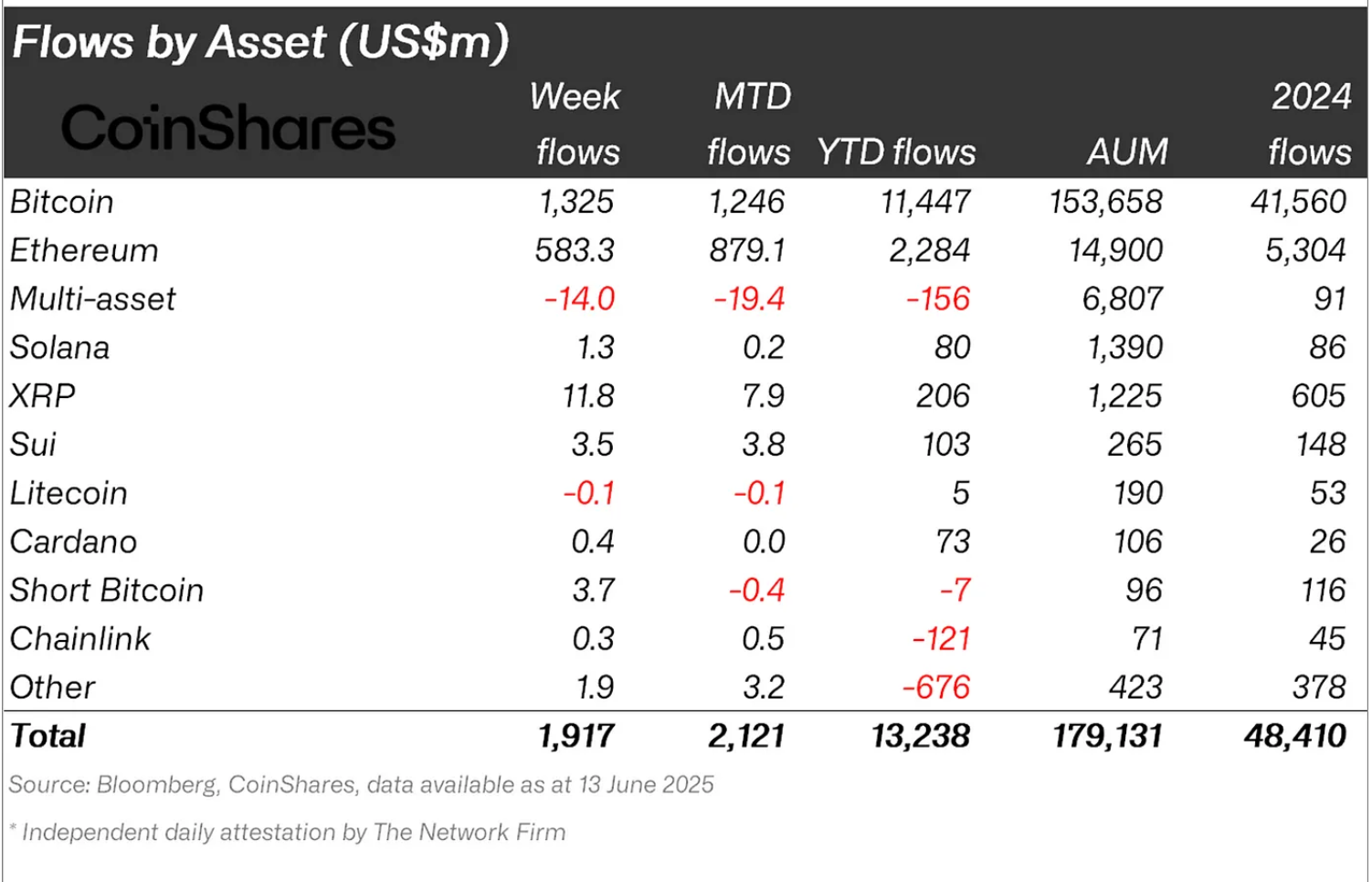 Esta forte acumulação coincide com uma onda de entradas de capital institucional em fundos de investimento focados em ETH. Somente na semana encerrada em 13 de junho, esses fundos atraíram US$ 583 milhões, elevando o volume total de fluxo de caixa líquido no acumulado do ano para US$ 2,28 bilhões, de acordo com o relatório semanal da CoinShares.