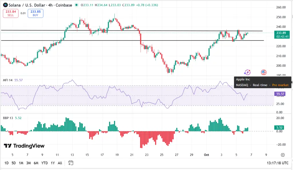 SOL atualmente é negociado em torno de $232,8, ganhando mais de 12% na última semana. Os analistas observam que a ascensão constante nos fluxos de capital e a acumulação mantiveram a atividade de compra alta.