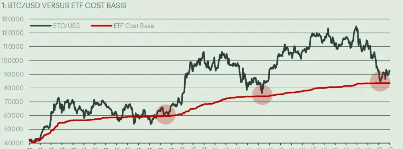 Desde o lançamento dos ETFs de spot, o Bitcoin exibiu ciclos de retorno baseados no custo, repetíveis, como mostrado no gráfico abaixo.
