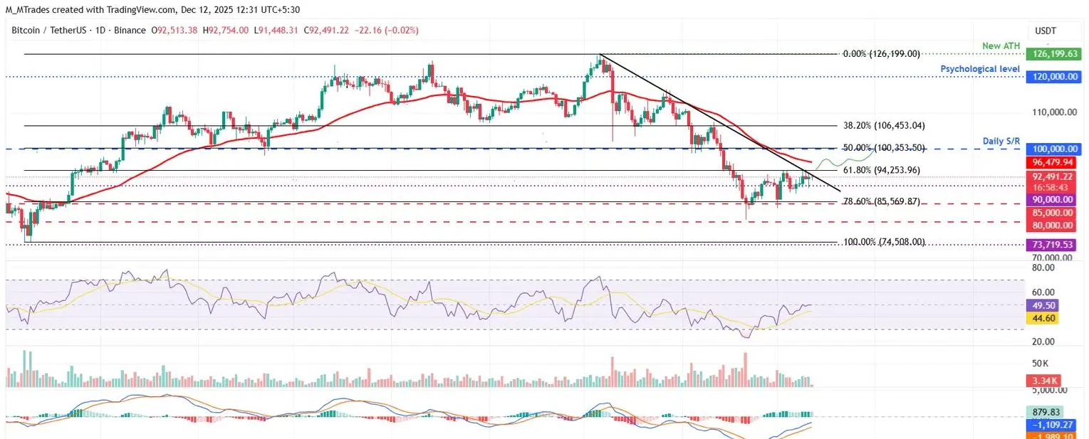 No gráfico diário, o preço do Bitcoin foi rejeitado na resistência de Fibonacci de 61,8% em $94.253 (traçado desde a baixa de abril de $74.508 até à máxima histórica de $126.199 estabelecida em outubro) na quarta-feira.