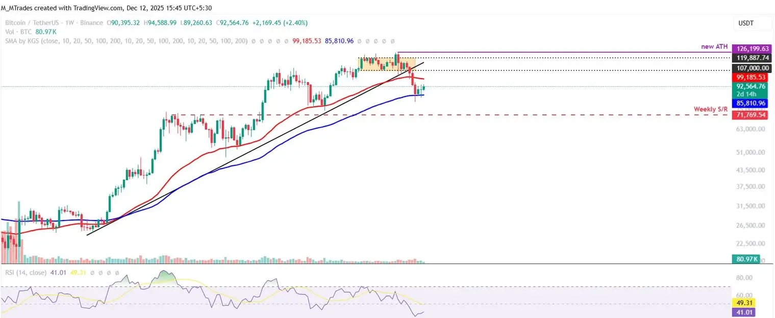 O gráfico semanal do Bitcoin mostra o preço a encontrar suporte em torno da Média Móvel Exponencial de 100 semanas (EMA) a $85.809, registando duas velas verdes consecutivas após uma correção de quatro semanas iniciada no final de outubro.