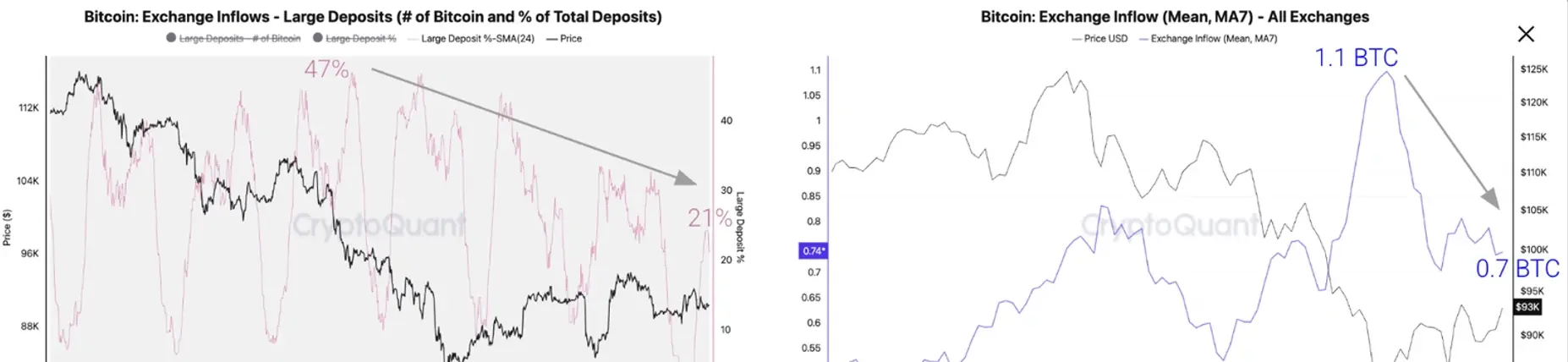 O relatório observa que os depósitos em exchanges aliviaram à medida que grandes players reduziram suas transferências para as exchanges. A proporção do total de depósitos de grandes players diminuiu de um pico médio de 47% a 24 horas em meados de novembro para 21% em quarta-feira.