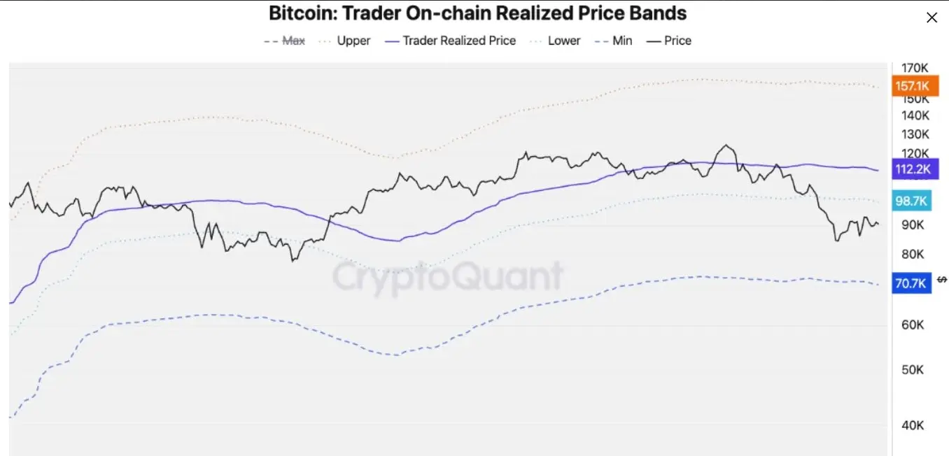 A CryptoQuant conclui que, se a pressão de venda permanecer baixa, uma recuperação de alívio poderia levar o Bitcoin de volta a $99.000. Este nível é a banda inferior das bandas de Preço Realizado On-chain do Trader, que funciona como uma resistência durante os mercados de baixa.