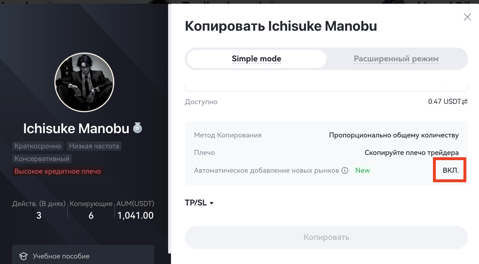 Простой режим копирования: Зайдите на домашнюю страницу копитрейдинга - отфильтруйте ведущих трейдеров - нажмите кнопку копирования - по умолчанию выбрано “Автоматическое добавление новых рынков”.
