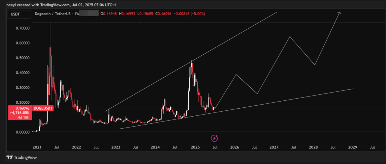 Целевая оценка: для возвращения к ATH требуется рост на 400%, исторические факты подтверждают это Исходя из текущей цены, DOGE должен вырасти на 400%, чтобы вернуться к предыдущему максимуму $0.73. Цель кажется далекой, но учитывая его удивительную вспышку в прошлом, это не является фантастикой. Технические графики не могут точно предсказать временные рамки, но устойчивая структура восходящего канала предоставляет прочную основу для этой возможности.