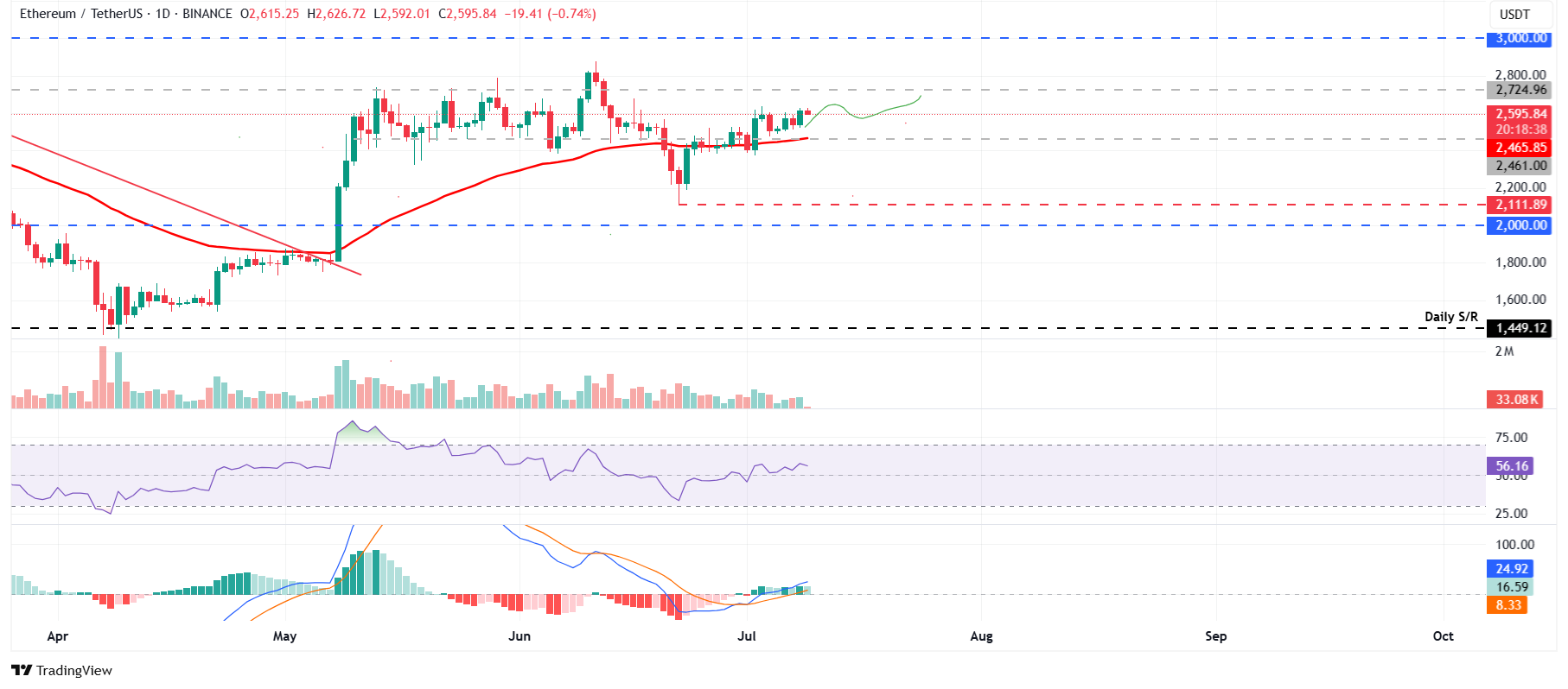 Цена ETH отскочила после поддержки около 2,461 долларов в прошлую пятницу, увеличившись на 4.38% во вторник. На момент написания этой статьи в среду, цена Эфира колебалась около 2,595 долларов.
