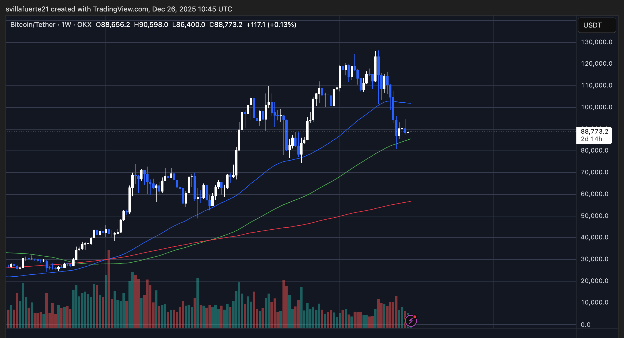 Биткоин торгуется около уровня $88 700 на недельном графике, стабилизируясь после резкого отката с максимумов $120 000–$125 000, достигнутых ранее в этом цикле. Хотя общий восходящий тренд с 2024 года остается в силе, недавние ценовые движения сигнализируют о явном замедлении импульса. Рынок перешел от импульсивной фазы расширения к коррекционной и консолидирующей структуре, при этом волатильность сжалась вокруг критической зоны поддержки.
