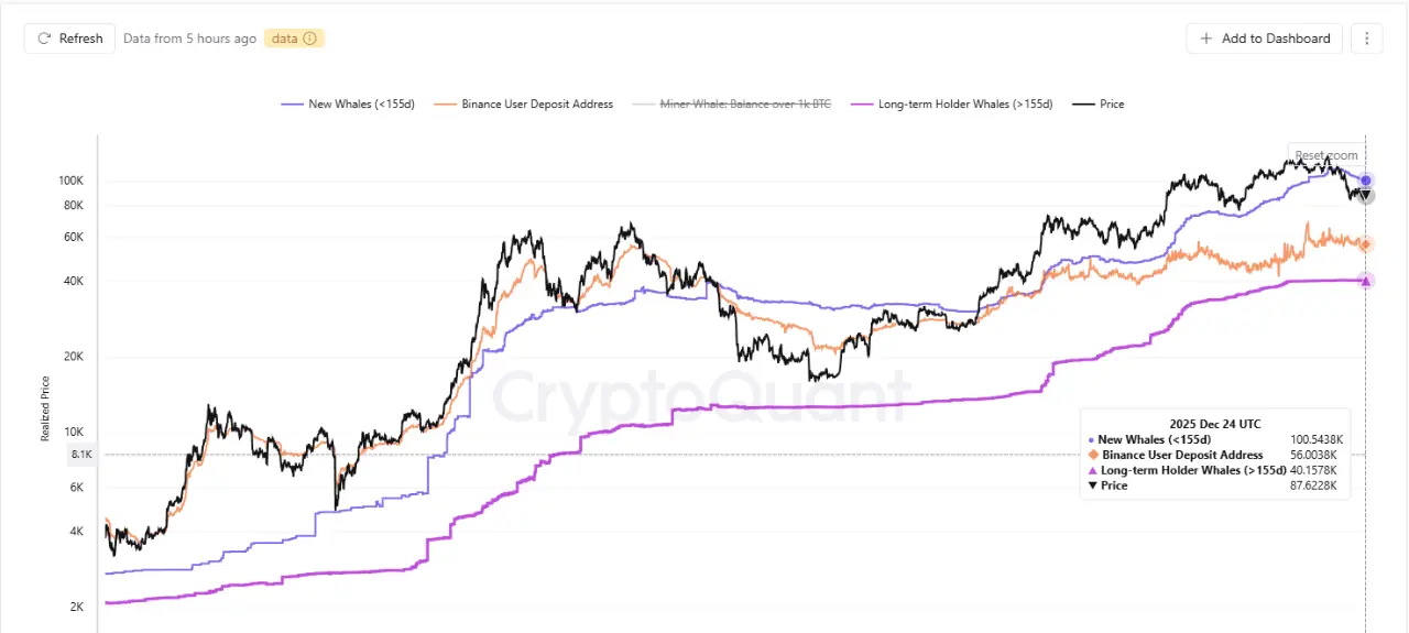 Данные показывают, что средняя базовая стоимость новых китов, определяемых как держатели монет младше 155 дней, сосредоточена около $100 500. Эта зона представляет собой критическую точку безубыточности для крупных игроков, недавно вошедших на рынок.