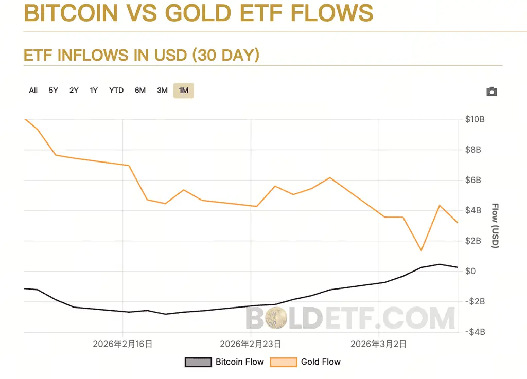 Март 2026 года ознаменовался появлением в глобальных финансовых рынках серии контрастных сигналов, вызвавших широкий общественный и аналитический резонанс. Самый крупный в США золотой ETF (GLD) за один день потерял 3 миллиарда долларов средств, установив рекорд крупнейшего за последние два года отзыва средств. В то же время, в тот же период, поток средств в спотовый Bitcoin ETF сменил негативный тренд на позитивный, завершив несколько недель чистого оттока. Эта динамика “один уходит — другой приходит” быстро стала предметом горячих обсуждений среди макро-трейдеров и криптоинвесторов: означает ли это, что институциональные деньги начинают перераспределяться с традиционных активов-убежищ, таких как золото, в сторону так называемого “цифрового золота” — биткоина? В статье на основе свежих данных по ETF и макроаналитической модели мы разберем внешние и внутренние причины этой волны капиталовложений.