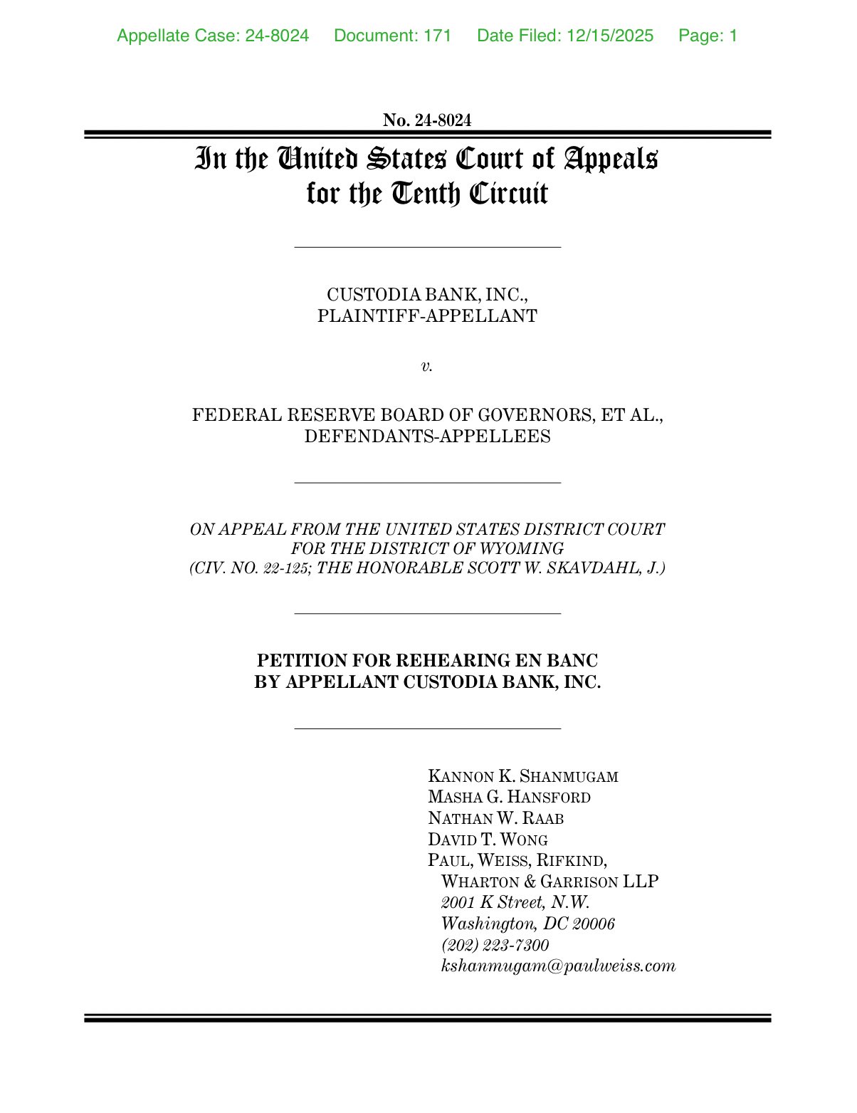 Криптобанк Custodia Bank, базирующийся в Вайоминге, подал ходатайство о повторном рассмотрении в полном составе (en banc), прося весь Апелляционный суд США по округу Колумбия? нет — по десятом округу пересмотреть ранее вынесенное решение, в котором Федеральная резервная система поддержала отказ Custodia в доступе к мастер-счету.