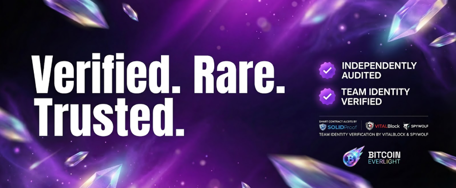 Ещё до открытия предпродажи Bitcoin Everlight завершил два независимых аудита смарт-контрактов — Spywolf и Solidproof — вместе с полной проверкой личности команды через Spywolf KYC и VitalBlock. Реальные личности, зафиксированные в записях, код, рассмотренный независимо — до того, как был поднят хотя бы один доллар.