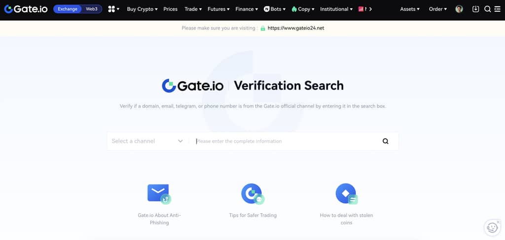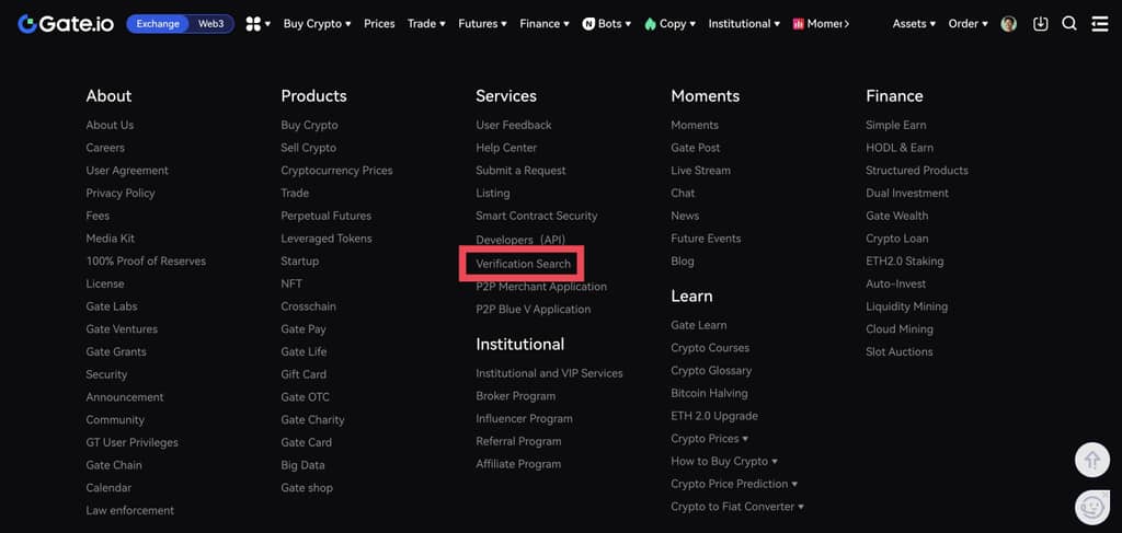 Gate resmi web sitesine gidin. Üst gezinme çubuğunda "Diğer" altında "Doğrulama Araması"na gidin. Bunları doğrulamak için URL'yi, e-posta adresini veya telefon numarasını buraya girin.