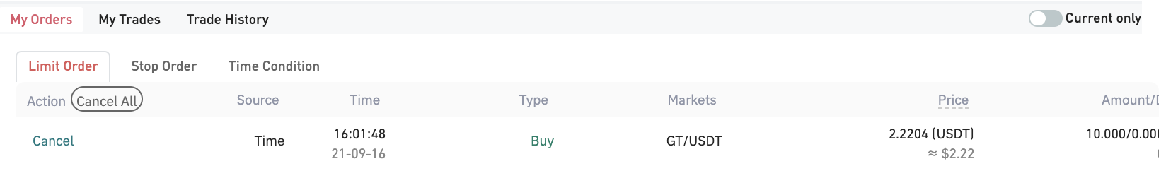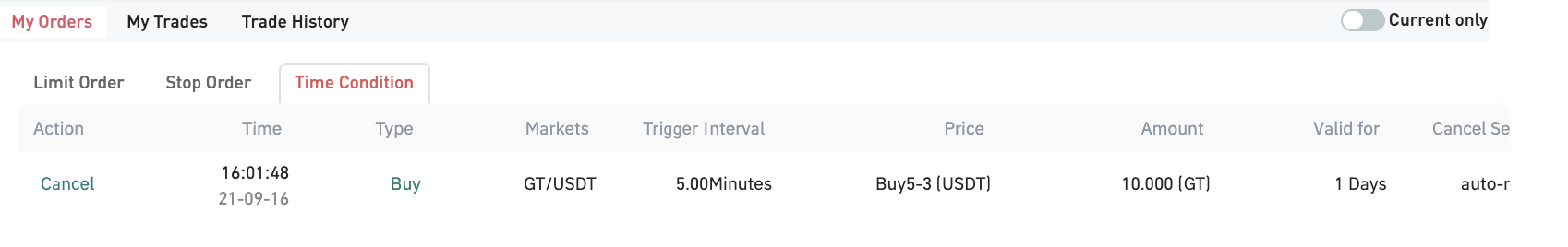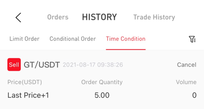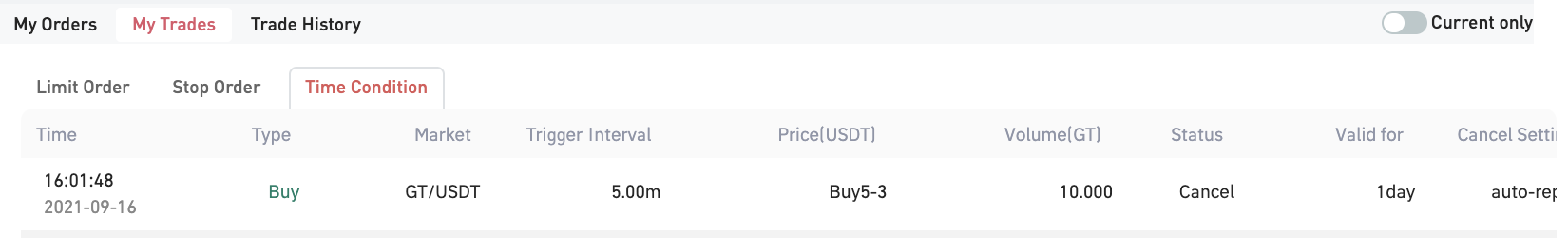 Peter'ın son zamanlarda GT madenciliği yaptığını ve kazancının otomatik olarak platformdaki hesabına yatırıldığını varsayalım. Hesabındaki GT belirli bir miktara ulaştığında, GT'sini USDT karşılığında satmak istiyor ancak gerçek zamanlı GT bakiyesini kontrol etmenin sakıncalı olduğunu düşünüyor. Bu durumda satış işlemini tamamlamak için “Zaman Koşulu ”nu kullanarak şu adımları izleyebilir: Tetikleme Aralığını 1 dakika, Fiyatı Son Fiyat+1 USDT, Miktarı 5 GT, İptal Ayarlarını 30 saniye Sonra İptal Et (bu süre Tetikleme Aralığından daha kısa olmalıdır) ve Geçerlilik süresini 2 gün olarak ayarlayın.