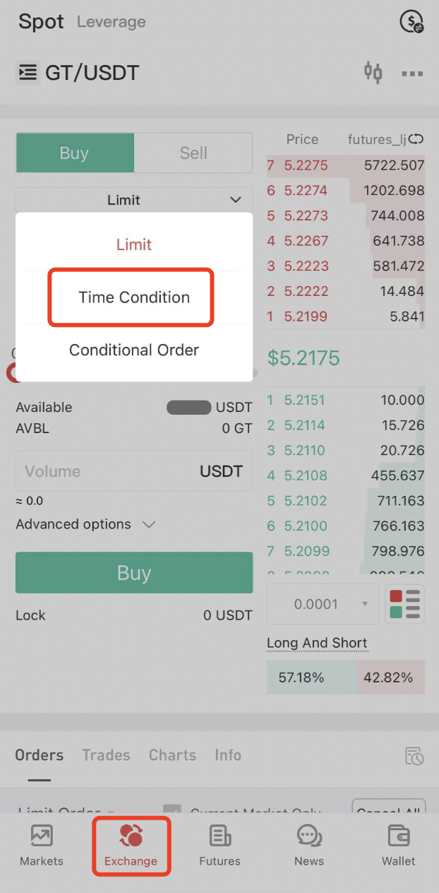 Gate hesabınıza giriş yapın ve spot ticaret sayfasına gitmek için “Borsa” (veya Android cihazlarda “Ticaret”) üzerine tıklayın. Tercih ettiğiniz işlem çiftini seçin ve ardından “Satış” panosu altında “Limit Emri” - “Zaman Koşulu ”nu seçin.