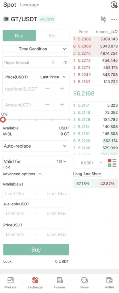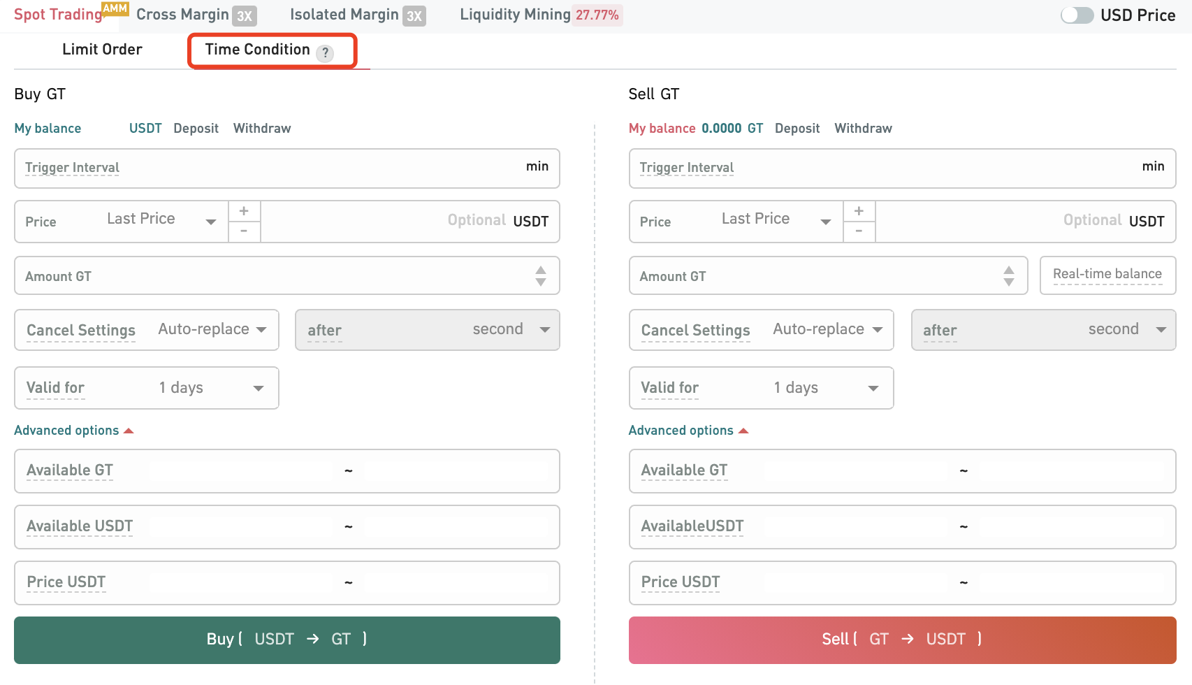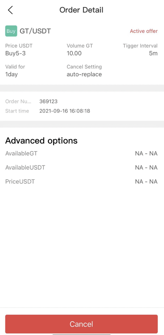 Örnek olarak yukarıda belirtilen durumu ele alalım. Tetikleme Aralığını 1 dakika, Fiyatı Son Fiyat + 1 USDT, Tutarı 5 GT, İptal Ayarlarını 30 saniye Sonra İptal Et (bu Tetikleme Aralığından daha kısa olmalıdır) ve Geçerlilik süresini 2 gün olarak ayarlayın. “Gelişmiş seçenekler” altında, GT'nin mevcut değerleri 10 ila 50 arasında ve Fiyat 5 ila 10 arasında değişir. Yukarıdaki tüm bilgileri onaylayın ve 16:00:00'da “Sat” düğmesine tıklayın.