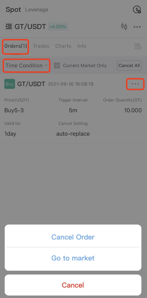 Emriniz verildikten sonra, henüz tetiklenmemiş veya iptal edilmemiş ya da süresi dolmamış bekleyen Zaman Koşulu emirlerini "Emirlerim" altındaki "Zaman Koşulu" bölümünden görüntüleyebilirsiniz. Kullanıcılar, bu emrin sağ üst köşesindeki "..." simgesine tıklayarak istedikleri zaman emirlerini iptal edebilirler.