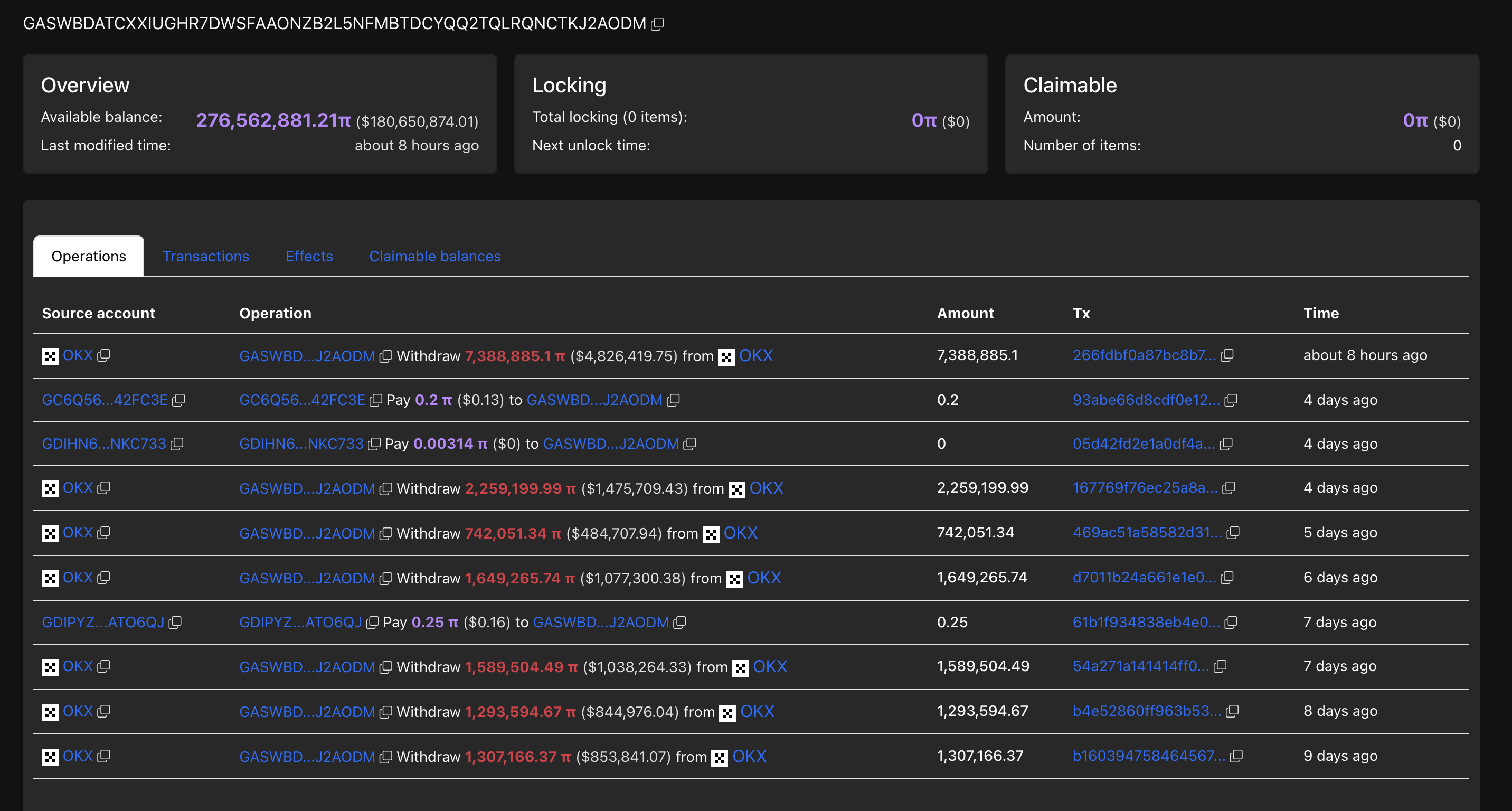 Pi Scan'den elde edilen veriler, piyasada büyük bir balinanın son iki ay boyunca PI tokenını aktif bir şekilde artırdığını gösteriyor. Bu balinanın elinde tuttuğu PI miktarı şu anda 276 milyon token'a ulaşmış durumda, bu da yaklaşık 180 milyon dolara denk geliyor. Özellikle, son 7 gün içinde OKX borsasından yapılan para çekme işlemleri büyük bir nakit akışını kaydetti ve bu miktar 13,62 milyon token'a ulaştı. En son para çekme işlemi, sadece birkaç saat önce gerçekleşti ve 7,38 milyon token'ın OKX'den çekildiği kaydedildi.