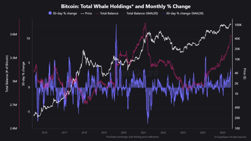 ! Toplam Bitcoin balina varlıkları | Kaynak: CryptoQuant"Bu endeks, borsa adreslerini ve madencilik havuzlarını hariç tutarak büyük sahiplerin gerçek bakiyelerini yansıtır. Bu, büyük yatırımcıların stratejik birikimi hakkında daha net bir bakış açısı sağlar. CryptoQuant analisti JA Maartunn, "Balina varlıklarındaki büyüme, genellikle uzun vadeli yükseliş döngüsünün ana itici güçleri olan kurumsal güvene ve güçlü temel talebe işaret ediyor" dedi.