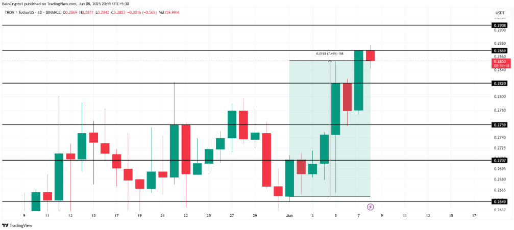 ! Tron Price Analysis | Source: TradingViewConversely, if the overall market maintains bullish sentiment, TRX could break through the $0.286 resistance level. Successfully breaking this barrier could send TRX towards the $0.290 level. This will invalidate the bearish outlook and set the stage for stronger growth.