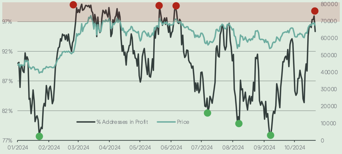 “Patterns emerge when large swings occur, and as we see a substantial percentage of addresses moving into profit, it typically leads to sell pressure,” Copper analysts said. “This could suggest that the market is experiencing a temporary top ahead of the U.S. election.”