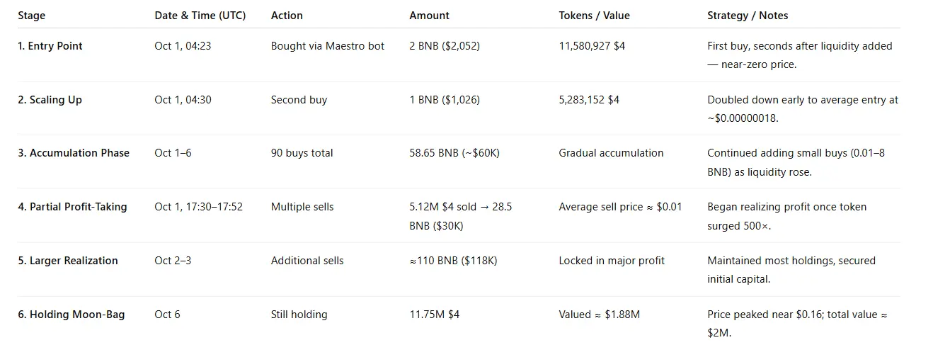 Zincir üzerindeki veriler, 0x872a...e6b8 cüzdanının 4 adlı yeni bir meme coin'de bir dizi erken alım yaptığını ve daha geniş pazar farkına varmadan patlayıcı kazançlar elde etmek için otomasyon araçları kullandığını gösteriyor.