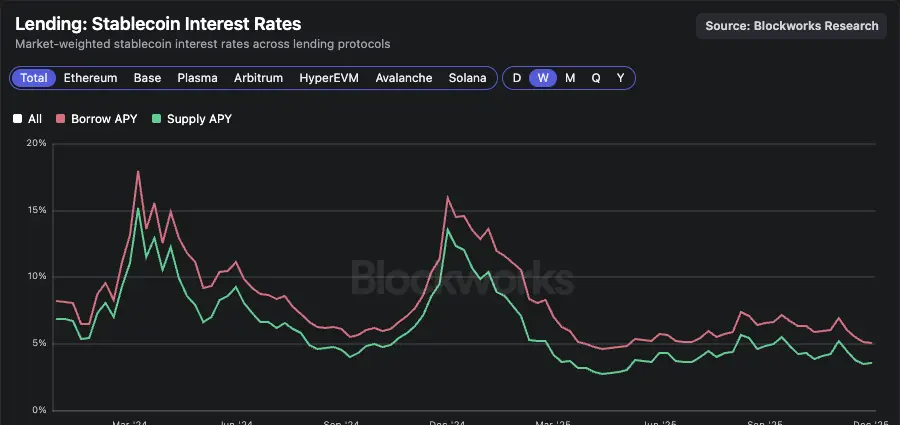 Notably, continued growth in the stablecoin supply comes amid very modest onchain yields. Benchmark supply rates on lending applications are reading 3.6%, a discount to SOFR at 3.9%. Growing depth in onchain stablecoin liquidity may continue to dampen the upside in supply rates, and absent a material risk premium to legacy rates, growth in stablecoin utilization on money markets may falter.