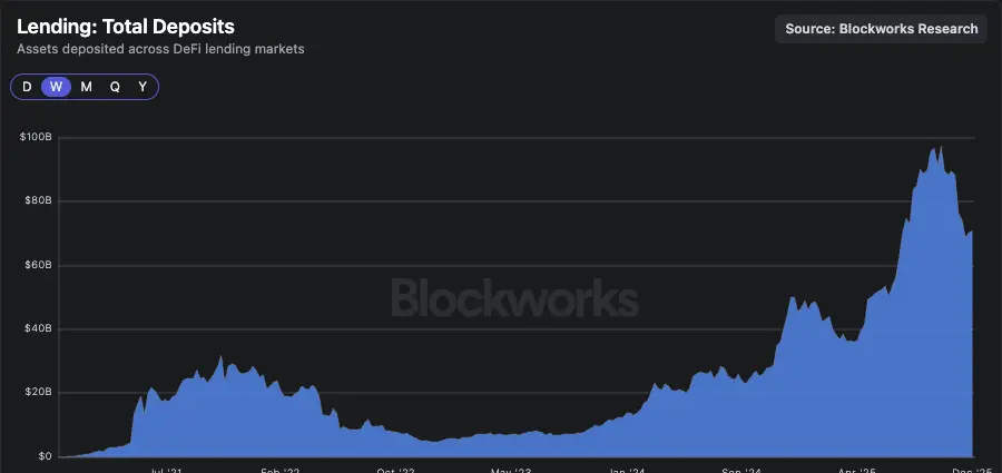 Amid the downtrend, don’t lose sight of the bigger picture, and take a moment to appreciate just how far we’ve come. At the bear market low, lending applications within DeFi accounted for just $5 billion in deposits, a rounding error within the larger financial system. In the years since, this figure has grown to $71 billion in deposits, having just previously tagged near $100 billion.