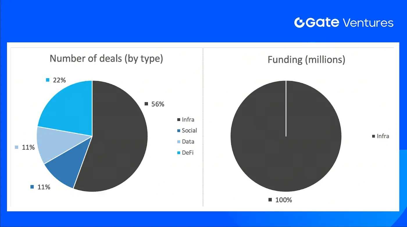 A total of 9 deals were closed in the previous week. Infrastructure led activity with 5 deals, accounting for 56% of total deal count. Social recorded 1 deal (11%), Data saw 1 deal (11%), and DeFi accounted for 2 deals (22%).