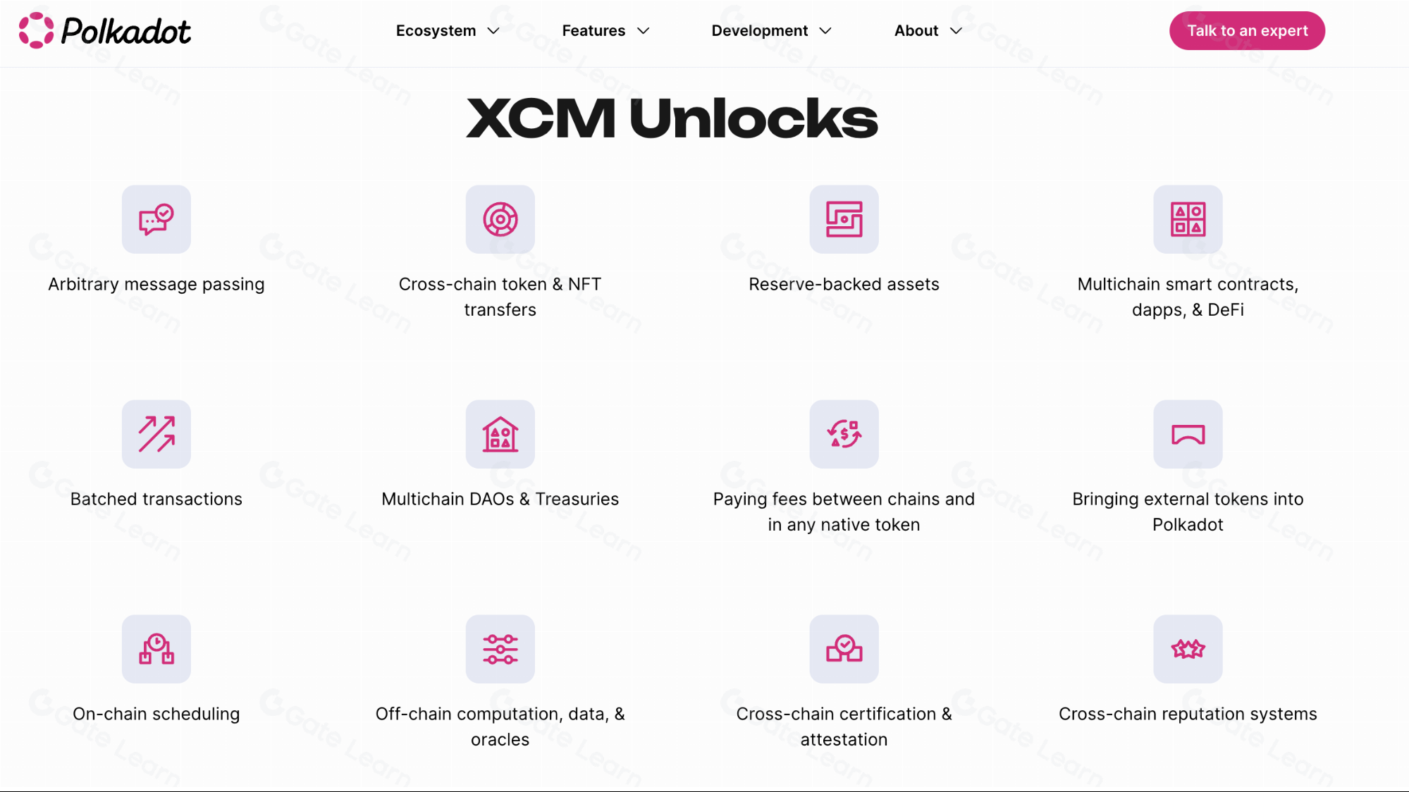 Крім передачі активів, XCM також призначений для полегшення більш складних взаємодій, таких як виклики міжланцюгових контрактів, отримання даних і навіть участь в іноземних механізмах управління. Такий рівень взаємодії є безпрецедентним у блокчейн-просторі та відкриває двері для справді інтегрованих мультичейн-додатків. Наприклад, DApp в одному парачейні може отримувати дані з іншого ланцюга, виконувати смарт-контракт у третьому ланцюгу та повертати результати користувачеві, і все це в безперебійному процесі, який не потребує довіри.