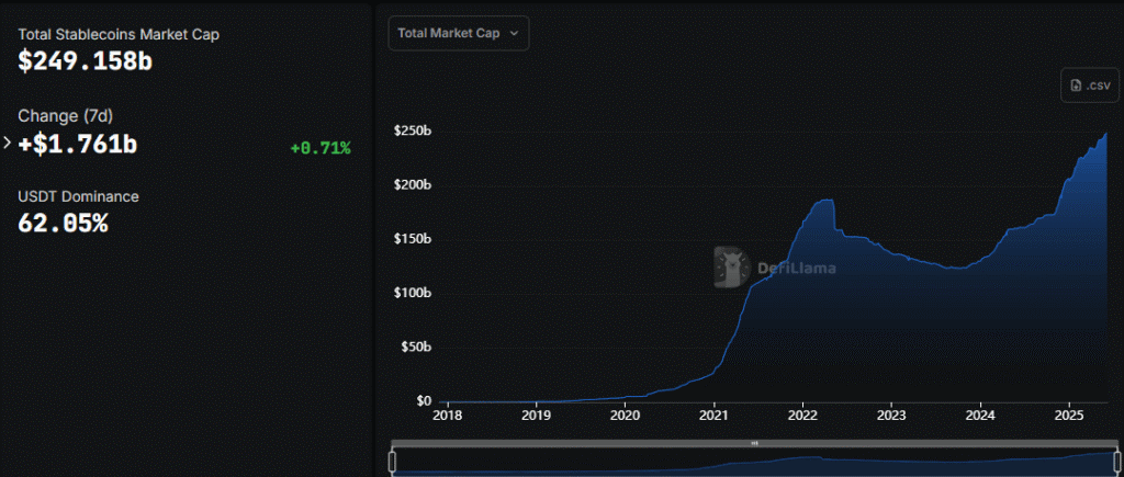 Згідно з даними DefiLlama, станом на 5 червня 2025 року загальна ринкова капіталізація основних стейблкоїнів, включаючи USDT, USDC і DAI, досягне $249 млрд порівняно зі $160 млрд рік тому. Це зростання на 80 мільярдів доларів є щорічним зростанням на 50%.