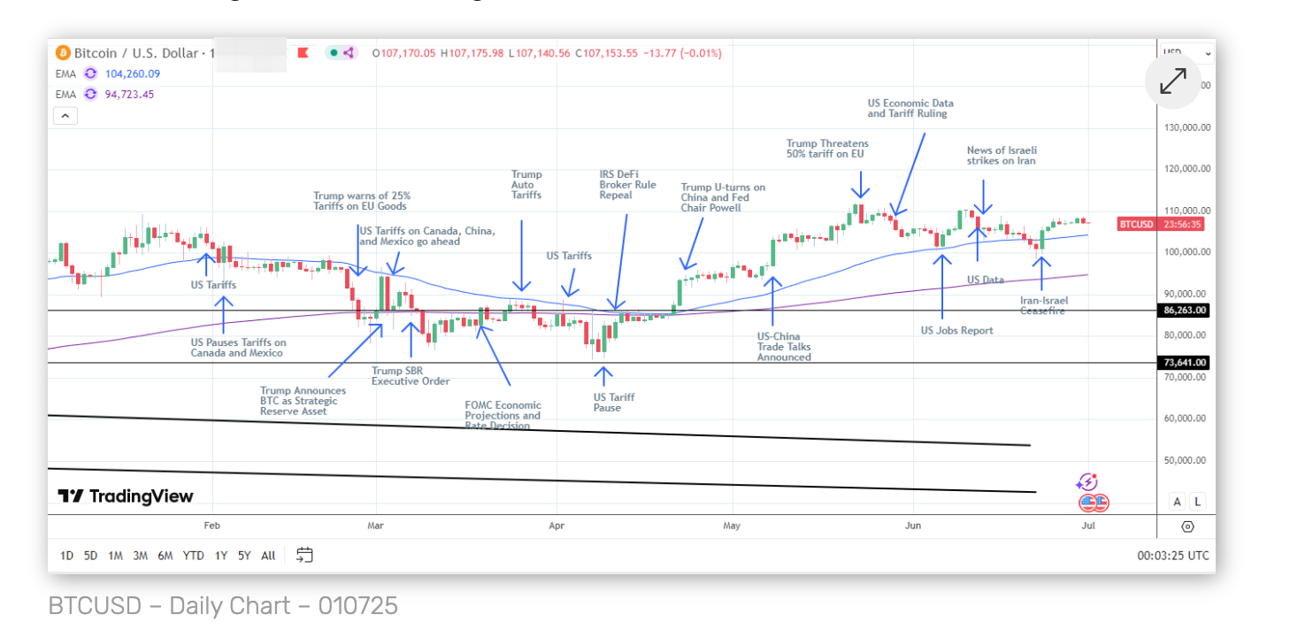 Біткойн 30 червня знизився на 1.09%, що стало реверсом зростання на 0.94% у минулу неділю, і закрився на 107,167 доларів.