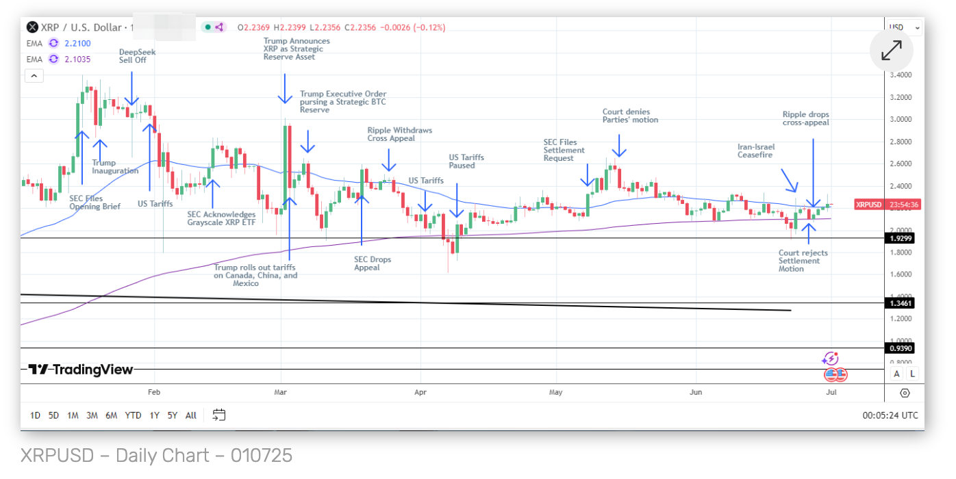 XRP місячний графік закрився зростанням: під впливом можливого відкликання апеляції SEC та очікувань ETF, XRP 30 червня (понеділок) зріс на 1,42%, позитивно завершивши торги червня.