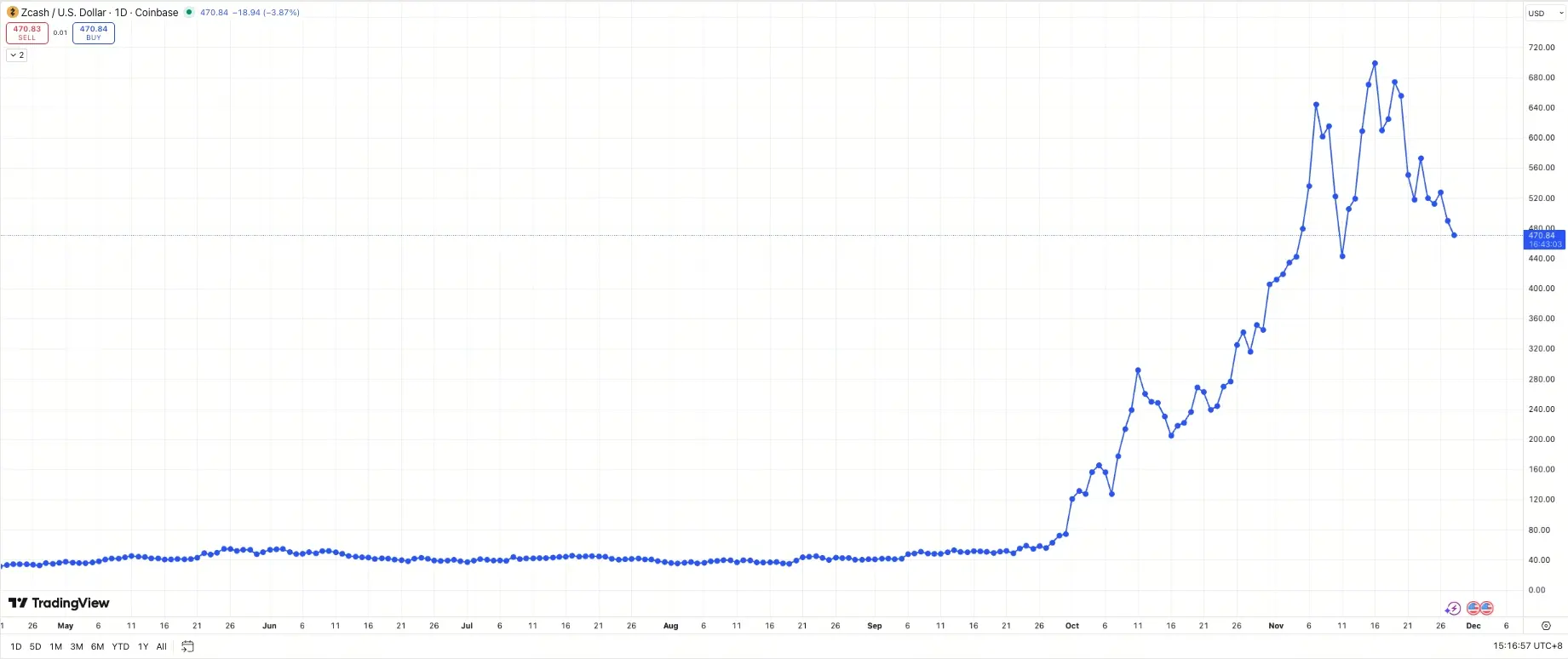 Загальна ринкова капіталізація криптовалюти з початку жовтня впала з понад 4,3 трильйона доларів до трохи більше 3,1 трильйона доларів, падіння становить приблизно 25%-28%, ціна Біткойна впала майже на 30% від історичного максимуму. На цьому фоні Приватна монета стала однією з найсильніших областей. Ринкова капіталізація Zcash зменшилася з менше ніж 1 мільярд доларів у серпні до понад 7 мільярдів доларів на початку листопада, зростання становило 600%-700%, і він на деякий час перевершив Monero, ставши найбільшою за ринковою капіталізацією Приватною монетою.