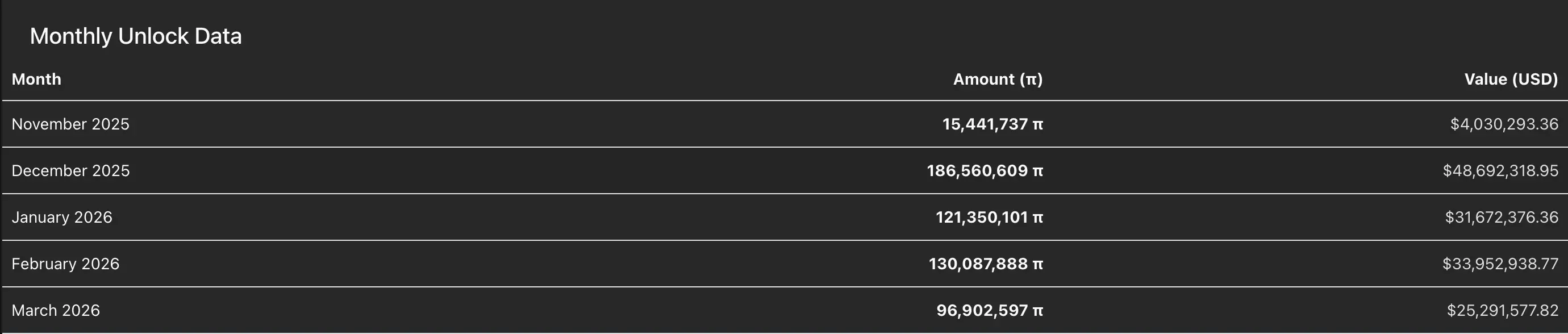 Pi Network 1,86 мільйона токенів PI, які будуть розблоковані у грудні, становлять 43% від загального обсягу 4,3148 мільйона токенів PI, які можна торгувати на централізованих біржах. Цей показник є вкрай рідкісним і небезпечним у подіях розблокування токенів. Зазвичай розблокування токенів посилює тиск на продаж в умовах падіння довіри інвесторів, а 43% збільшення пропозиції достатньо, щоб викликати паніку на ринку.