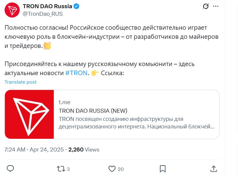 24 квітня 2025 року в X Джастіна Сана з’явилося повідомлення російською мовою. У ньому підприємець говорить про те, що «російська спільнота — один з найважливіших учасників криптовалютної спільноти».