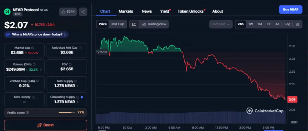 Đồng coin gốc của Near Protocol đã mất hơn 10% giá trị trong 24 giờ qua, do sự sụt giảm đáng kể của thị trường chung.