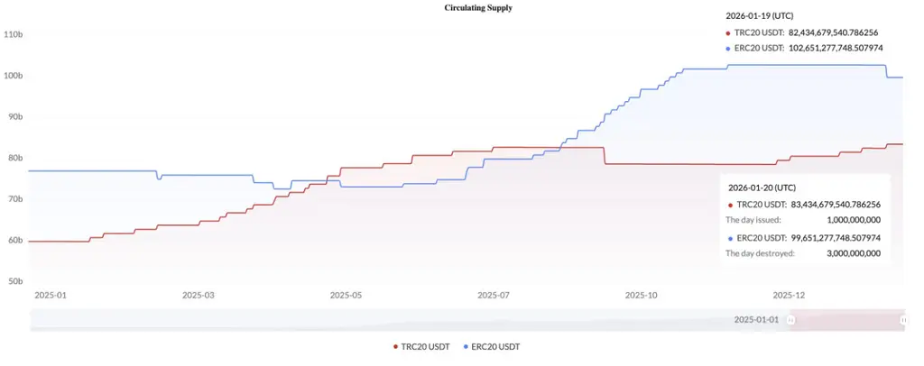 Vào ngày 19 tháng 1 năm 2026, USDT trên Tron (TRC-20) ghi nhận 82.434.679.540 token. Một ngày sau, vào ngày 20 tháng 1, con số nhảy lên 83.434.679.540. Sự thay đổi này đại diện cho hơn 1 tỷ USD USDT trong một ngày qua việc đúc trực tiếp trên Tron.