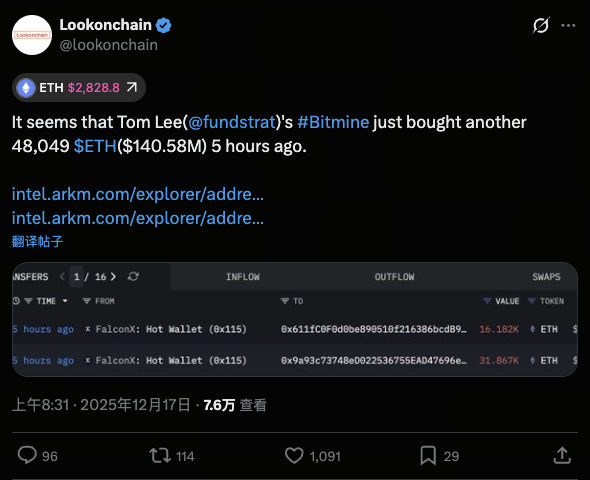 近期,加密市場出現一項備受矚目的機構動向:BitMine Immersion Technologies(簡稱 BitMine)於最新一輪以太坊(ETH)購買中,大幅增持 48,049 枚 ETH。根據市場消息,BitMine 主要透過機構通道 FalconX 完成資產接收,整體投資金額約達 1.4 億美元。