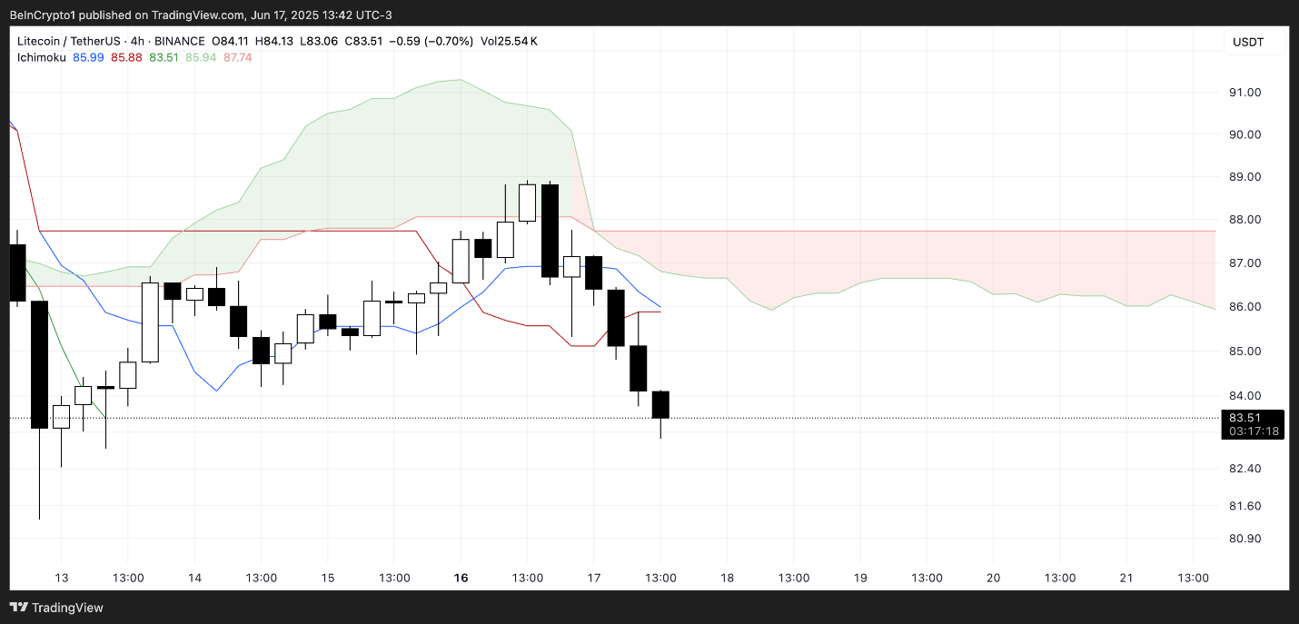 萊特幣的Ichimoku Cloud圖表目前顯示出下跌的配置,價格行動遠低於紅色雲圖(Kumo),表明下跌動能。