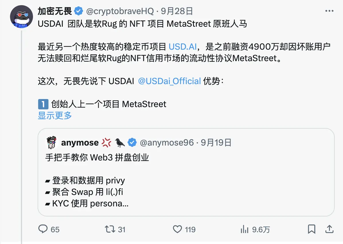 但看衰的一方則認爲,USD.AI 所引入的借貸模型尚未經過市場的充分驗證,以無法通過傳統渠道獲得足額融資的 AI 公司作爲主要借款方,這其實是個 Debuff,該機制能否長期有效持續仍是個未知數;此外 KOL 「加密無畏(@cryptobraveHQ)」 還曝出 USD.AI 的團隊疑似爲曾 Rug 的前 NFT 項目 MetaStreet 的原班人馬,可能存在黑歷史……