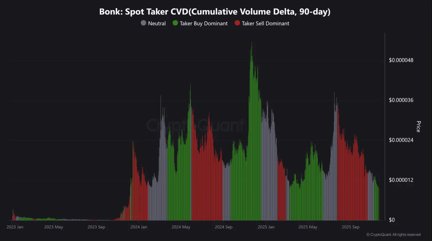 來自CryptoQuant的數據顯示,現貨與合約市場上的「鯨魚」正大舉進場布局BONK。這些大單恰逢BONK價格進入折價區間並逼近長期積累型態頂部之際出現。