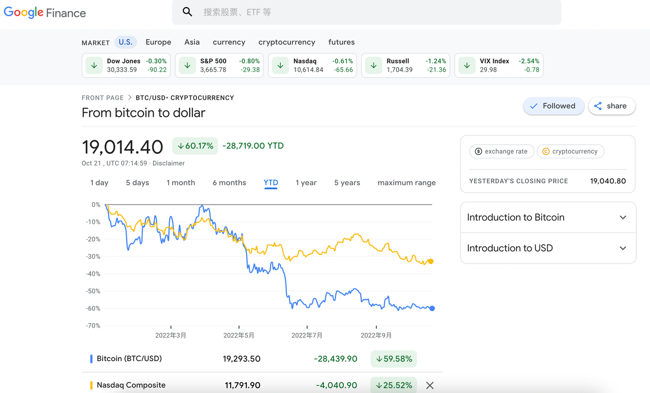 根据 Google财经数据,加密市场与美股市场走势呈现高相关性。从 2022 年初至今, BTC 价格损失 28719 美元,跌幅达 60.17%,而美股纳斯达克指数跌幅达 25.52%。从折线图可以看出,二者的价格趋势几乎同步,最低点、最高点、行情转折点都几乎在相关的时间线上。