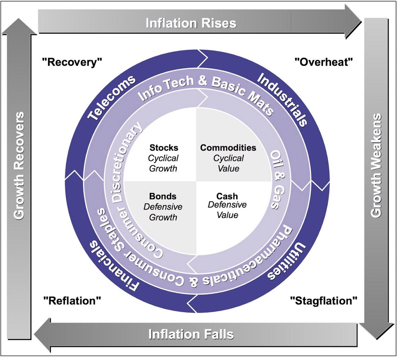 为了方便理解现在所处的阶段,先科普一个概念——美林时钟。美林时钟是美林证券提出的一套资产配置理论,主要描述了不同经济周期下对应的投资策略,也就是告诉投资者,“当前处于什么阶段,这个阶段如何配置资产”。